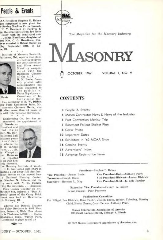 The Masonry Institute of Washington, D. C., has joined with SCPI in constructing a cut-away full-size family fallout shelter on the second floor of the National Housing Center. Member N. Litterio did the masonry work with N. W. Cushwa supplying the materials.