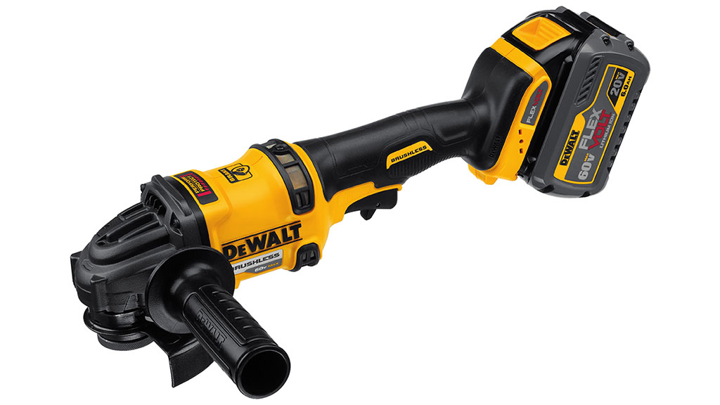 For high-power cutting and grinding of concrete and masonry, the DEWALT 60V MAX* 4.5- to 6-In. Grinder features a brushless motor that maximizes runtime for demanding applications, allowing for up to 126 cuts of ½-inch rebar on a single charge using a FLEXVOLT battery and 6-inch FLEXVOLT cutting wheel. The grinder is also a Perform & Protect tool, designed to provide a high level of tool control without sacrificing performance. Key features of the DEWALT 60V MAX* 4.5- to 6-In. Grinder include its Kickback Brake, which automatically shuts down and slows the wheel to a stop when a wheel pinch is detected. It has power equivalent to 13 amps or 1,700 MWO (as compared to the D28144) and a brake with less than 2-second stop time that slows the wheel when the trigger is released.