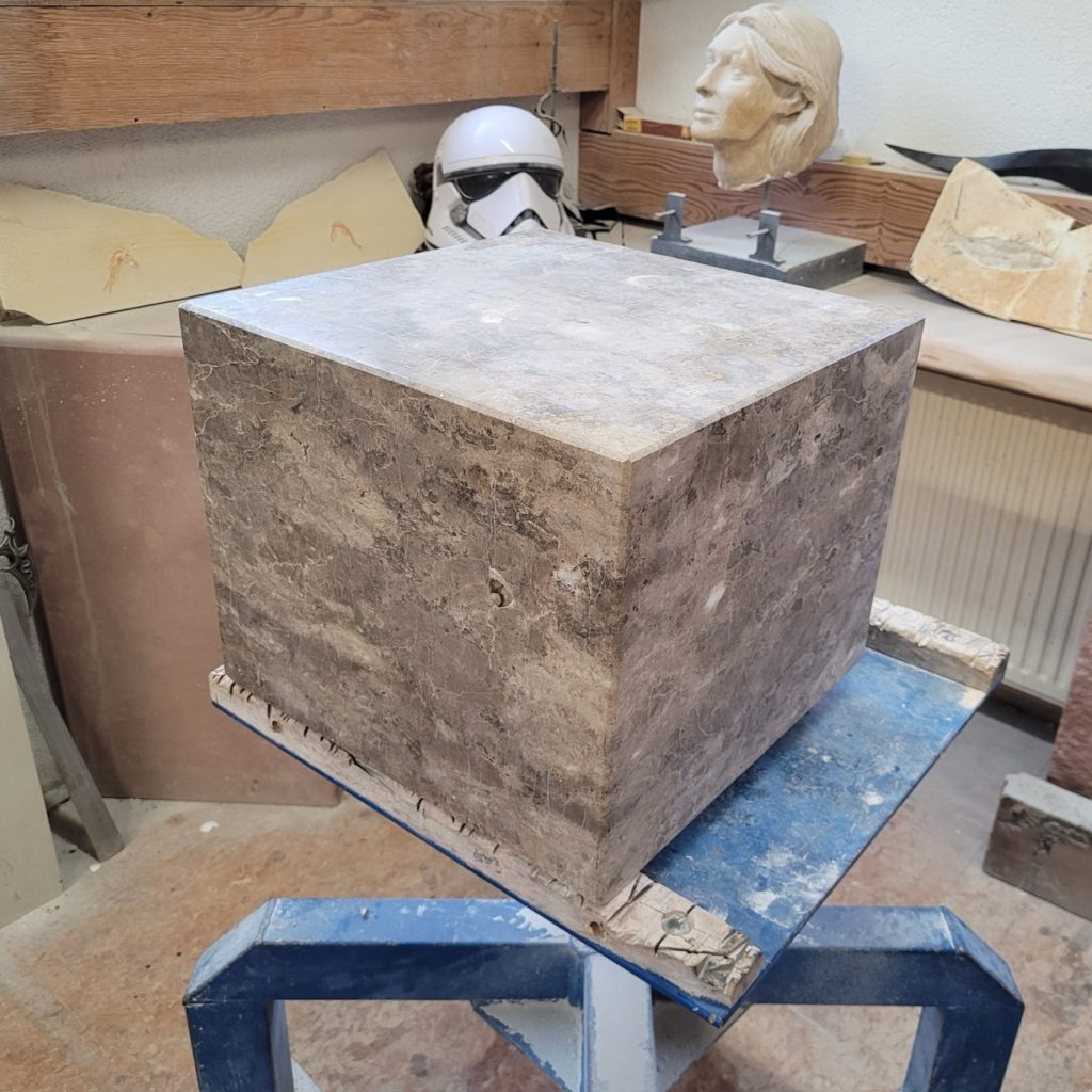 I used a brown-beige dolomite called "Limes dolomite" as the material. An interesting stone full of veins and crystals. This choice of material was intended to give the T-60 helmet the appearance of 200 years of weathering in the inhospitable wasteland.