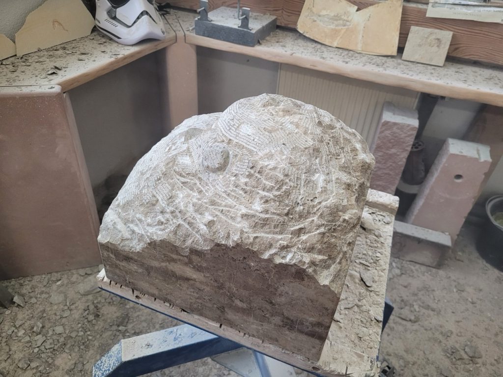 The two brackets at the side of the eye openings were particularly challenging. For these pieces, I removed the stone to such an extent that these brackets were only a few millimeters thick and remained completely free-standing. After they were finished without any damage, I was really proud of them and this gave me new motivation.
