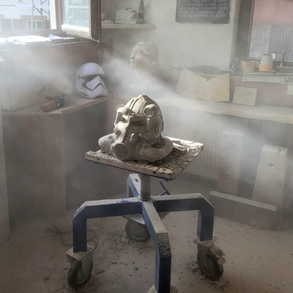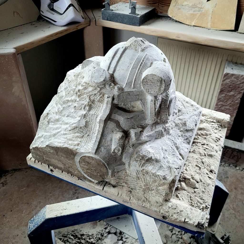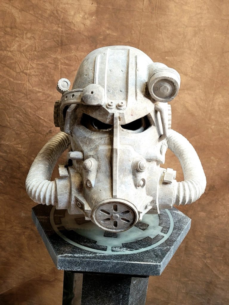 A unique project from this Fallout story has now made the long journey from my first idea to the finished stone sculpture. A helmet from one of the legendary “T-60” Power armors.