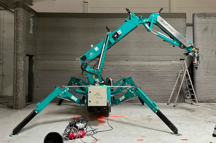Spherical Block LLC is working with Sustainable Construction Solutions, which uses Constructions 3D’s MaxiPrinter robotic arm 3DCP equipment. The MaxiPrinter unit has retractable legs which stabilize it and is able to fit through a doorway and be set up. Vertical joints of mortar are readily deposited by simply placing CMUs in a vertical orientation, so that the mortar joint is horizontally deposited on the end of a row of adjacent blocks. The blocks are rotated 90° before they are placed, so that the head joint mortar becomes vertically oriented as it is placed in the horizontal bed of mortar.