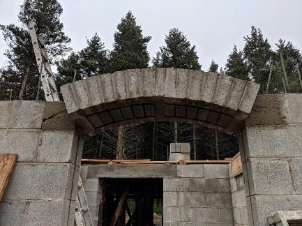 #3 rebar (3/8-inch diameter) is recommended for arched roof and dome construction. Rebar is arranged at 8-inch intervals and is anchored in either the vertical walls (extending down into the core holes of the block) or is anchored directly into the foundation. The rebar is curved into the arc of the roof structure (arch or dome) to create a support structure on which blocks are laid. Blocks are then laid with mortar, in a manner quite similar to which standard vertical masonry walls are assembled. A specific, detailed description of the assembly for various structures is beyond the scope of this article: this is simply intended to provide a general overview of the assembly method. It is recommended that a form be provided on the inside of the arch to help the mason create an accurate and more precise arch profile.