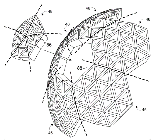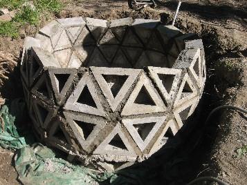 The “hex” and “pent” are triangular blocks used to assemble into spheres or sections of spheres, such as domes. Six hex blocks assemble into a curved hexagon, and five pent blocks assemble into a curved pentagon. There are a number of geodesic geometries that these two blocks can assemble into, both together and each by itself. By using a larger number of blocks within any specific geometry, different sized structures (domes and spheres) can be made. These blocks have a groove located in each of its three abutting faces to accept rebar. This lets the blocks be supported by a framework of rebar, so that minimal or no centering or support scaffolding is required.