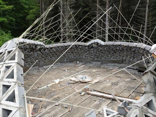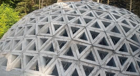 Spherical is working with basaltic FRP rebar provided by Smarter Building Systems. This rebar has a high tensile strength and is exceptionally resistant to chemical attack and corrosion (e.g., resistant to saltwater corrosion). This material is lightweight and easily provides the curved surfaces required for arch and dome roofs. Smarter Building Systems has this material available in a number of thicknesses and configurations, including as a mesh or grid.