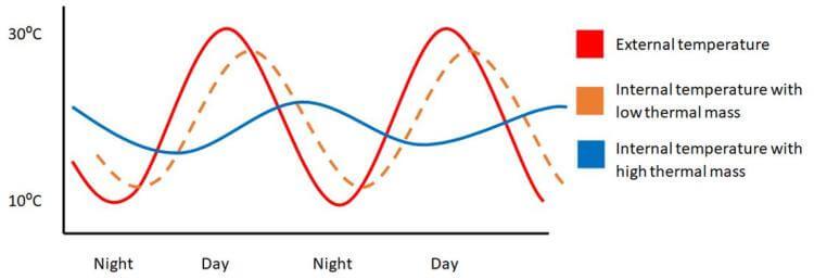 This masonry system takes advantage of the thermal mass benefits created by using a complete masonry building envelope. Masonry has a high specific heat (thermal mass) which provides the ability for the building envelope—including walls and roof—to store heat energy and subsequently release this heat energy back to the inside of the building. This concept also applies to both keeping a building warm in cold weather and keeping a building cool in hot weather. In order to maximize this thermal mass benefit, it is recommended to place thermal insulation on the outside of the masonry building envelope, like wrapping a warm stone in a cozy blanket. This arrangement creates a delay from the time it takes cold temperatures during winter (or hot temperatures during summer) to travel through the building and affect the interior. This delay also creates a lag on the peak energy demand: that time of day when everyone’s heat has to go on to warm a building, or when everyone’s air conditioning turns on to cool their homes. This delay significantly reduces the peak energy demand for a power grid, and power grid requirements are defined by their peak demand.