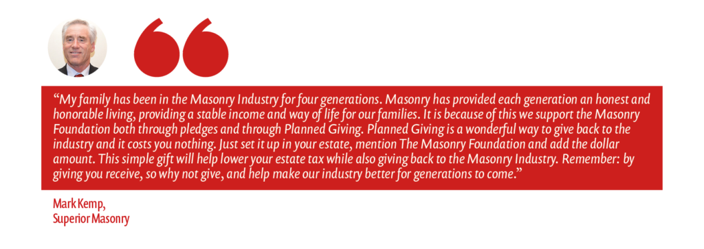 Planned Giving is the process of establishing a designation in a will to support a specific cause. We have several in our industry who have already made this designation in their planning. It is a great way to support the Foundation, and is a pretty simple process. Please feel free to reach out to the MCAA for more details on this. As part of planned giving, some may be interested in designating insurance policies or purchasing one for that purpose. See more on this process in a future issue of MASONRY Magazine. Planned Giving can have tax advantages for your estate as well, and all questions on tax savings should be directed to tax experts handling your estate planning.