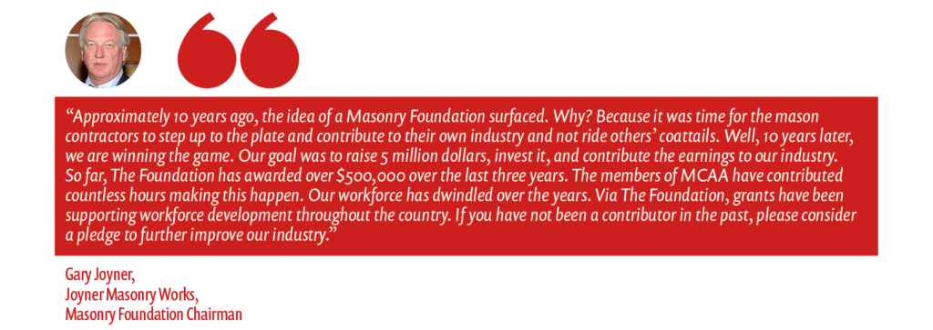 The second way we see The Masonry Foundation growing is through support from the industry as a whole. We are kicking off this process today, and are asking people who read MASONRY to consider supporting your industry’s efforts by making a pledge or contribution today. All donations are tax-deductible charitable contributions. Join the many who have seen the Foundation’s vision as an integral part of bettering our industry. You can make a one-time contribution, or you can make a pledge to the Foundation over time.