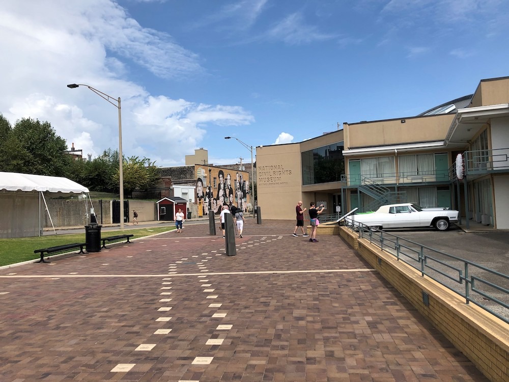 One story up was a concrete balcony and a gray art deco metal railing, upon which hung a wreath, which looked like a life preserver. Parked at ground level, where we stood in front of Room 206, were two automobiles from the era. On a low brick wall, a railing of the same design separated us from the cars. Before us, on an angle to ease its reading was a rectangular plaque with information about Dr. King’s assassination. One of the images on the plaque was the picture I mentioned earlier, a half dozen people pointing. The plaque wasn’t a solid rectangle; it was cleaved into two halves. Not in squares as one might expect, but rather at an angle and in a way that caught our attention because it seemed odd. The fingers of the people in this picture were directed at this cut. I tried to make sense of the design choice when Susie whispered, “Do you see?” and she gestured to the bricks upon which we stood.
