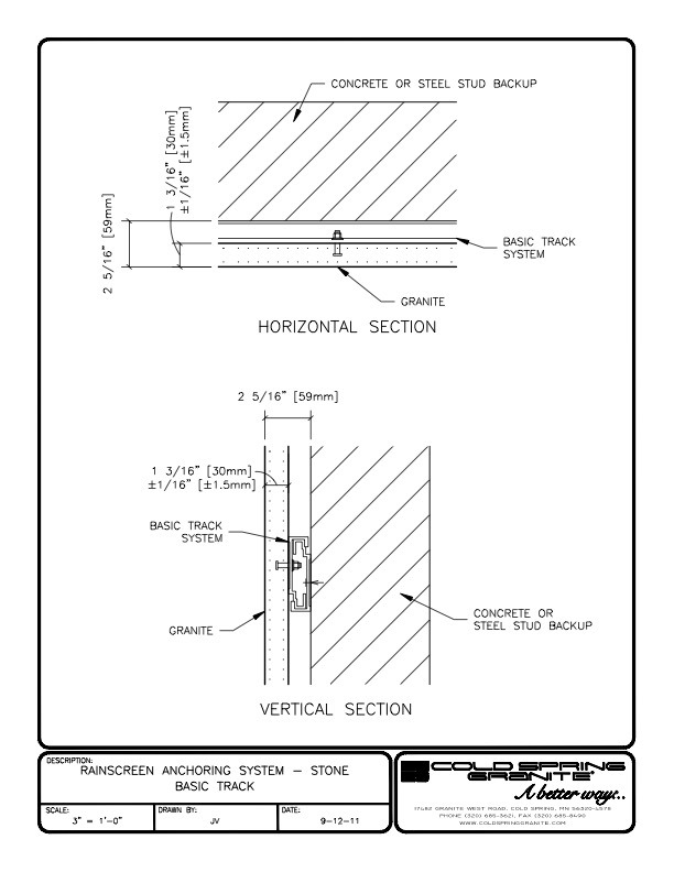 The track-type system is perhaps the most widely used way of securing stone to a rainscreen system. A track system combines wall anchors to support kerf-cut thin stone and works essentially as a clip configuration that allows the stone to be attached to an aluminum or stainless-steel rail with a Type 31 anchor.