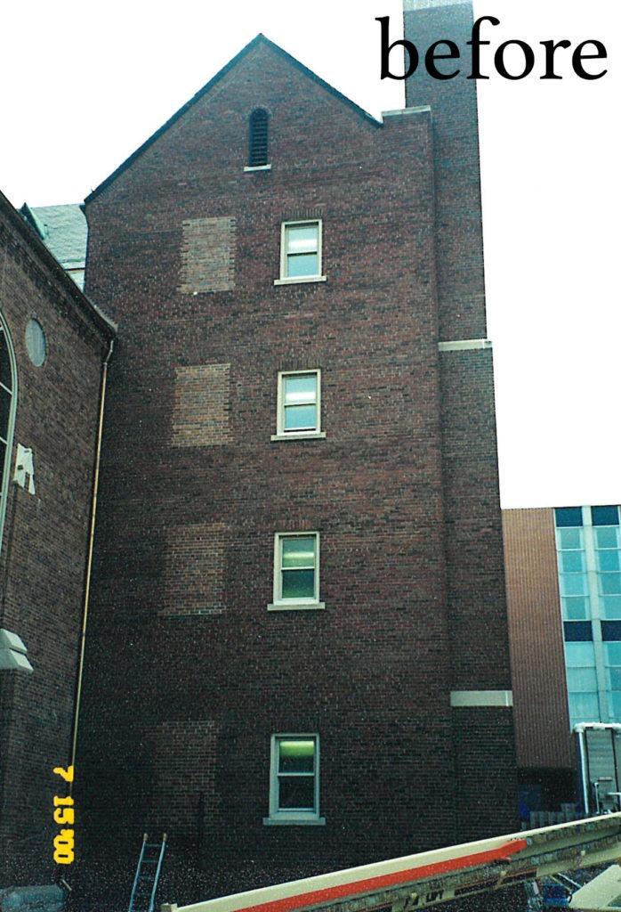 Attention is in the details for any successful project, and it is important in this Case Study that we were able to document what the newly stained brick looked like 21 years ago. The Masonry Cosmetics Team’s photography was not as advanced then as it is today, but it did capture the results of our extensive work at that time. We went back in 2019/2020 to retake pictures showing how our project still looks today. Examples are given here illustrate the before, during, and after stages of the project 21 years ago, along with current photos of that building today, proof positive of the longevity success of the Proven Masonry Stain.