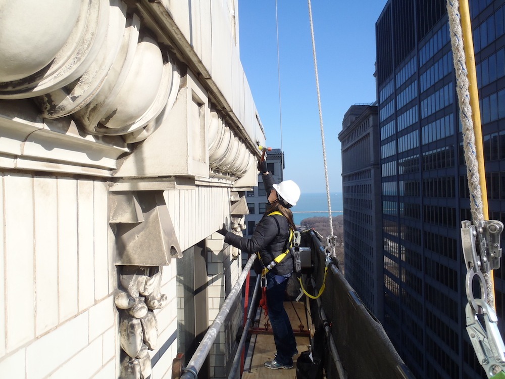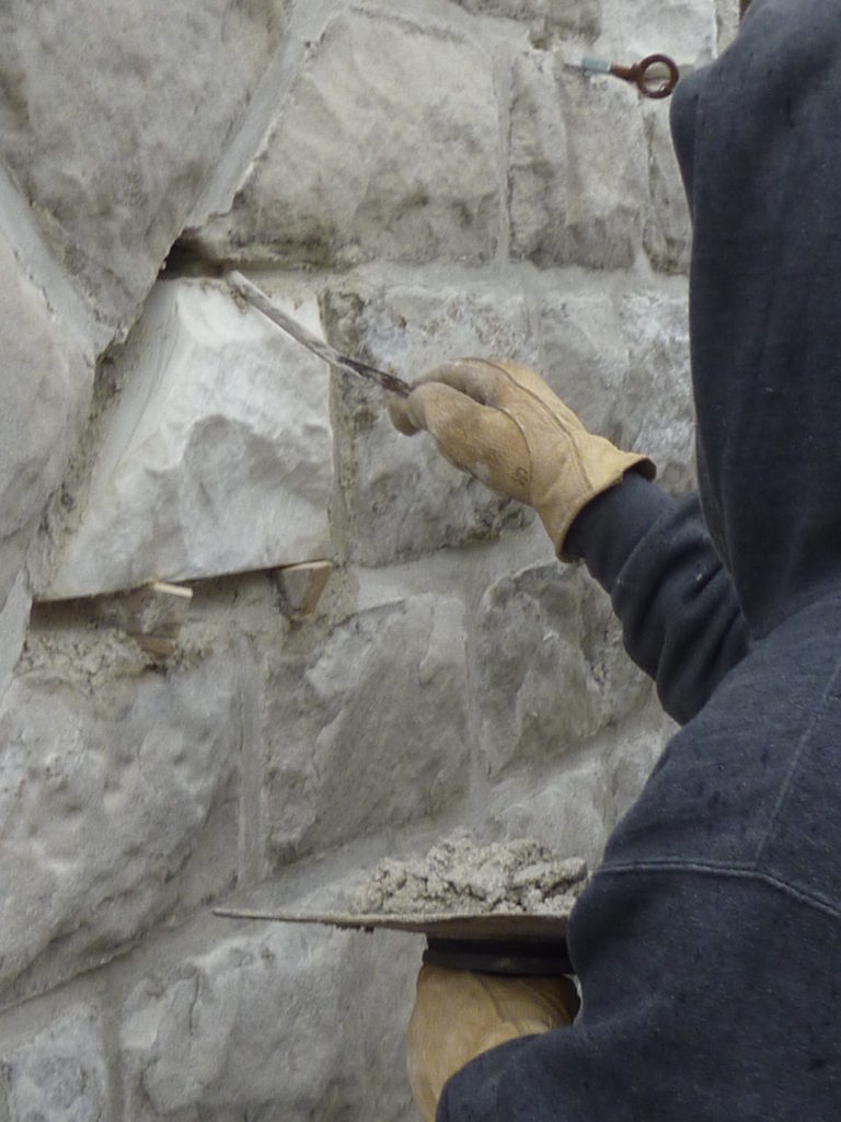 Figure 10: Certified mason installing stone replacement and pointing mortar. Photo by Roy Ingraffia.