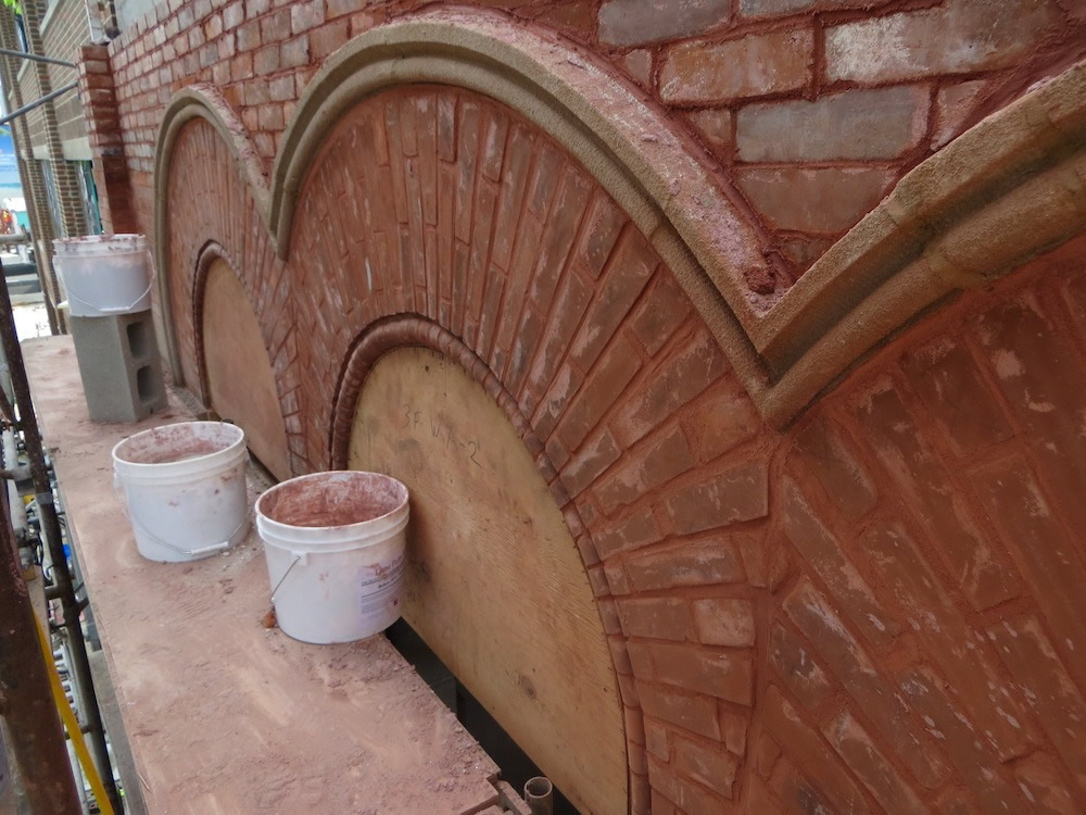 Every terra cotta piece for the first floor had been coded and cataloged and was put into the same location as previously. A new steel beam was installed above the first floor and then the process of brick and limestone installation proceeded for the remaining floors. Some damaged brick, which was documented before removal, needed to be replaced, and Western searched far and wide for old salvaged brick to match the existing old brick.