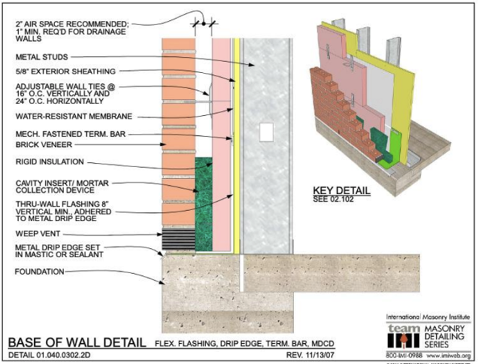 A standard base-of-wall detail often illustrates a 2-inch recommended air space behind the brick, complete with a mortar collection device and full head joint weeps resting on through-wall flashing. However, per the TMS 402/602 Masonry Code, the minimum required air space between the back of the brick and the face of insulation (if present) or backing is 1 inch.
