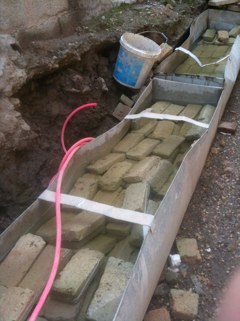 In 2007, the government moved out over 3,000 thousand occupants to begin a massive restoration of over 620 mud brick dwellings and commercial and religious buildings. Mud bricks are a common building material in many countries. UNESCO mandates that fired bricks be used in the restoration rather than mud bricks but their physical properties must be close to the original mud bricks. Figure 4 shows some “modern” molded, fired bricks soaking before their use because they have very high absorption (approximately 24% to 35%).  Dependent upon the source of the clay, these bricks often include straw mixed in with the soil during molding to limit shrink cracking.