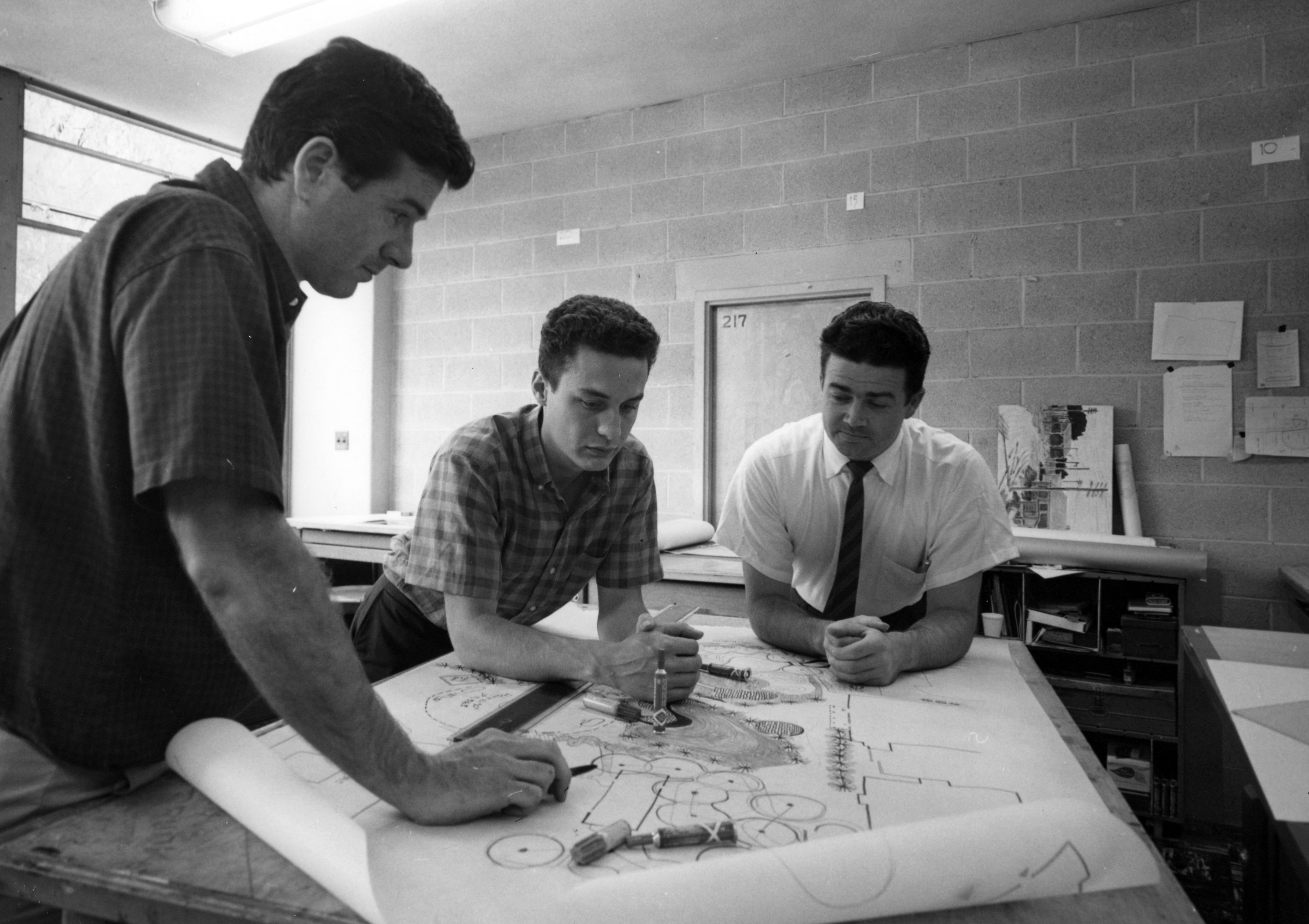 Freshman in this approach started with concepts like “space,” “line” and assorted other universal design principles to initially dissociate architectural design from building, and unify its origins to fine arts abstraction. Architecture was merely one venue for this conceptual enterprise. It was a radical idea in 1954. The Texas Architecture program described its mission in the “Conduct of Courses In Design” portion of the its official handbook, stating its perspective in perfectly sexist language of its Mid-Century origins: “The purpose of architectural education is not alone to train a student for professional occupation, but above all to stimulate his spiritual and intellectual growth, to develop his intellectual faculties and to enable him to grasp the meaning of architecture.”