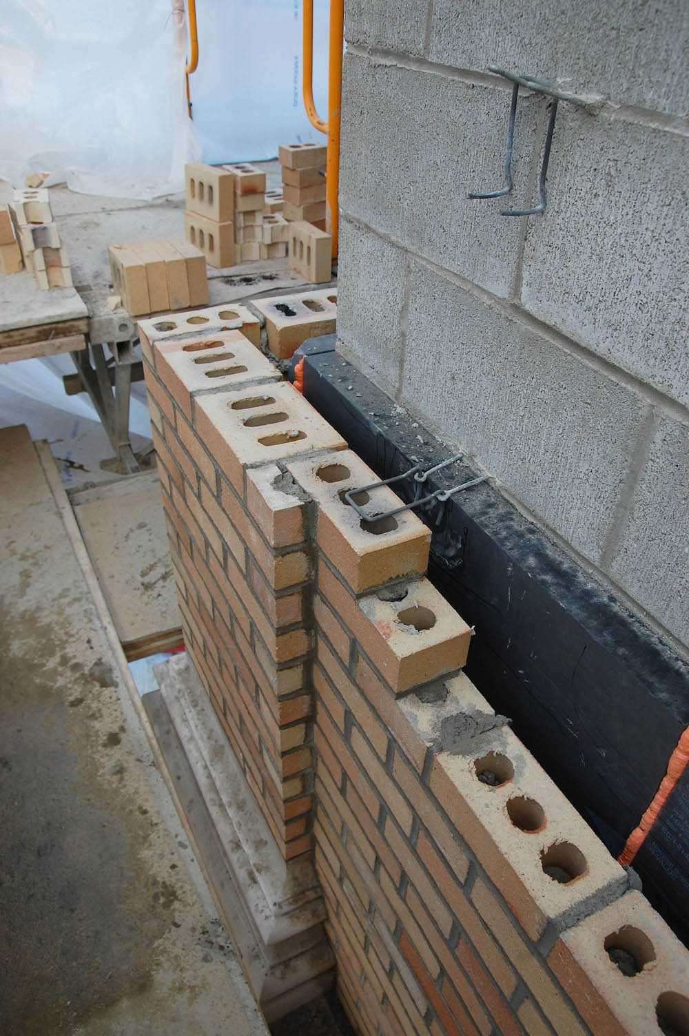 It was determined at bidding that an all-inclusive weather-resistive barrier system called CavityMate Ultra Air Barrier from Dow Chemical would be beneficial for the project. Masons installed the air barrier and insulation in sequence with their brickwork instead of engaging another trade to apply a liquid air barrier.